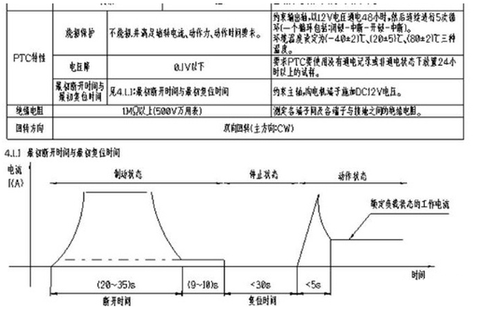 (1)中控鎖280電機(jī)光片(插件型基本已經(jīng)淘汰,極少使用)選型要根據(jù)各廠家生產(chǎn)的參數(shù)實(shí)裝匹配。24V和12V電壓電機(jī)的選型方法類同,主要參數(shù)是堵轉(zhuǎn)電流及堵轉(zhuǎn)電流的變化曲線,因中控鎖正常工作時(shí)間很短(不超過(guò)1s),不考慮工作工作電流。室溫堵轉(zhuǎn)保護(hù)時(shí)間為20~35s理想,但國(guó)產(chǎn)電機(jī)質(zhì)量的現(xiàn)實(shí)情況溫升較快,一般15~25s保護(hù)即可,(少數(shù)只能滿足8~15s)??傊跐M足電機(jī)不燒毀的情況下,較長(zhǎng)的保護(hù)時(shí)間可以提高PTC的使用壽命,減少誤保護(hù)和扭矩不夠的情況。-----(后備箱鎖,方向盤鎖,油路鎖選型方法類似)