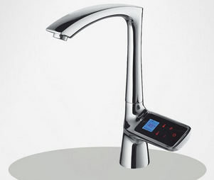 具備溫顯和調溫裝置的電熱水龍頭,主要是包括有進水管、出水口、閥芯以及控水手柄和控溫手柄,其特征在于上述自來水龍頭采用雙柄冷熱水龍頭,在自來水龍頭的進水管上設定有電加熱裝置,該電加熱裝置由對應的具備漏電保護開關、停水保護裝置和過熱保護裝置的中央控制器控制,自來水龍頭出水溫度由電加熱裝置加熱,并在此用測溫型NTC熱敏電阻器感知溫度,由中央控制器取決可否加熱。