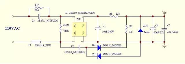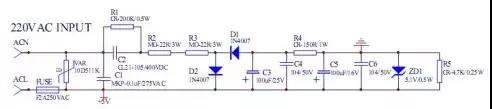 此圖是一個220VAC/50Hz供電輸出5.1VDC <30mA的阻容降壓原理圖,交流電源從ACL和ACN端輸入,其中FUSE(F2A250V保險管)為過流保護,VAR(10D511K壓敏電阻)為浪涌保護,C1(MKP-X2  0.1uF/275VAC安規電容)為交流濾波電容,因這三個器件和線路板(或稱PCB)直接關系到控制器的安全與電磁兼容性,所以它們必須通過銷售國的安全認證,如在中國銷售的必須通過CCC認證,其它如美國的UL認證、歐洲的TUV或VDE認證、日本的JET認證等。源林電子所生產的壓敏、熱敏電阻認證齊全。可聯系客服查看。