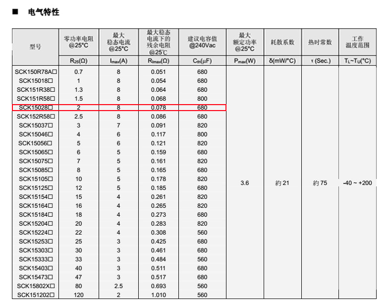 熱敏電阻: 穩騰 熱敏電阻型號: SCK15028MSY 熱敏電阻片徑: Φ15mm 零功率電阻@25℃: 2Ω 工作溫度范圍: -40℃±200℃ 儲存溫度范圍: -40℃±85℃