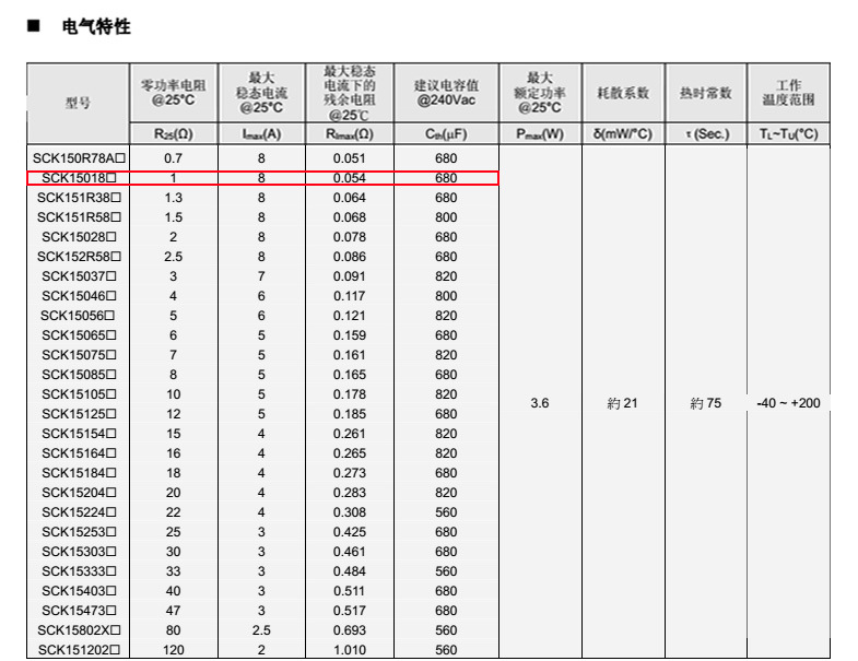 熱敏電阻: 穩騰 熱敏電阻型號: SCK150018MSY 熱敏電阻片徑: Φ15mm 零功率電阻@25℃: 1Ω 工作溫度范圍: -40℃±200℃ 儲存溫度范圍: -40℃±85℃