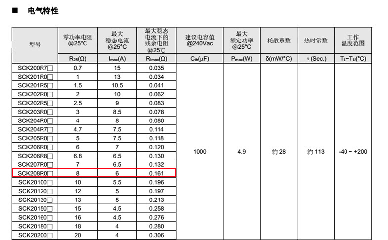 熱敏電阻: VT 熱敏電阻型號: SCK208R0MSBY 熱敏電阻片徑: Φ20mm 零功率電阻@25℃: 8Ω 工作溫度范圍: -40℃±200℃ 儲存溫度范圍: -40℃±85℃