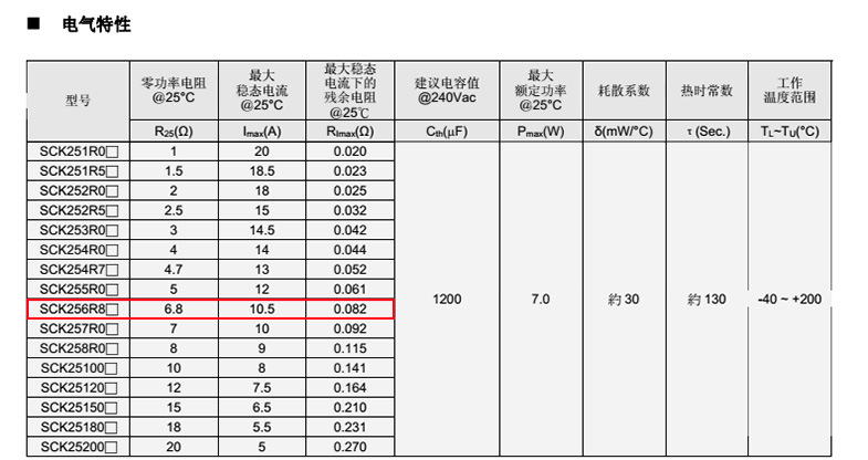 熱敏電阻: VT 熱敏電阻型號: SCK256R8MSY 熱敏電阻片徑: Φ25mm 零功率電阻@25℃: 6.8Ω 工作溫度范圍: -40℃±200℃ 儲存溫度范圍: -40℃±85℃
