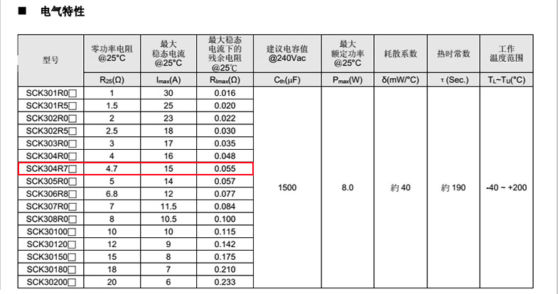 熱敏電阻: VT 熱敏電阻型號: SCK304R7MSY 熱敏電阻片徑: Φ30mm 零功率電阻@25℃: 4.7Ω 工作溫度范圍: -40℃±200℃ 儲存溫度范圍: -40℃±85℃