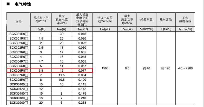熱敏電阻: VT 熱敏電阻型號: SCK306R8MSY 熱敏電阻片徑: Φ30mm 零功率電阻@25℃: 6.8Ω 工作溫度范圍: -40℃±200℃ 儲存溫度范圍: -40℃±85℃