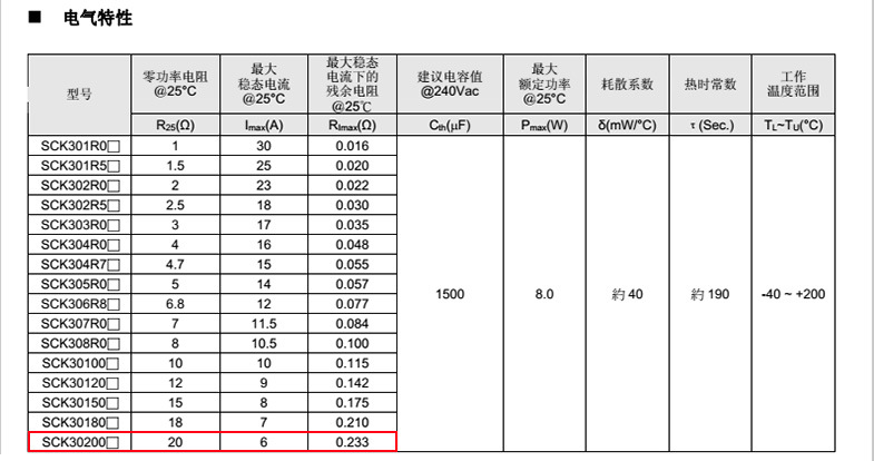 熱敏電阻: VT 熱敏電阻型號(hào): SCK30200MSY 熱敏電阻片徑: Φ30mm 零功率電阻@25℃: 20Ω 工作溫度范圍: -40℃±200℃ 儲(chǔ)存溫度范圍: -40℃±85℃